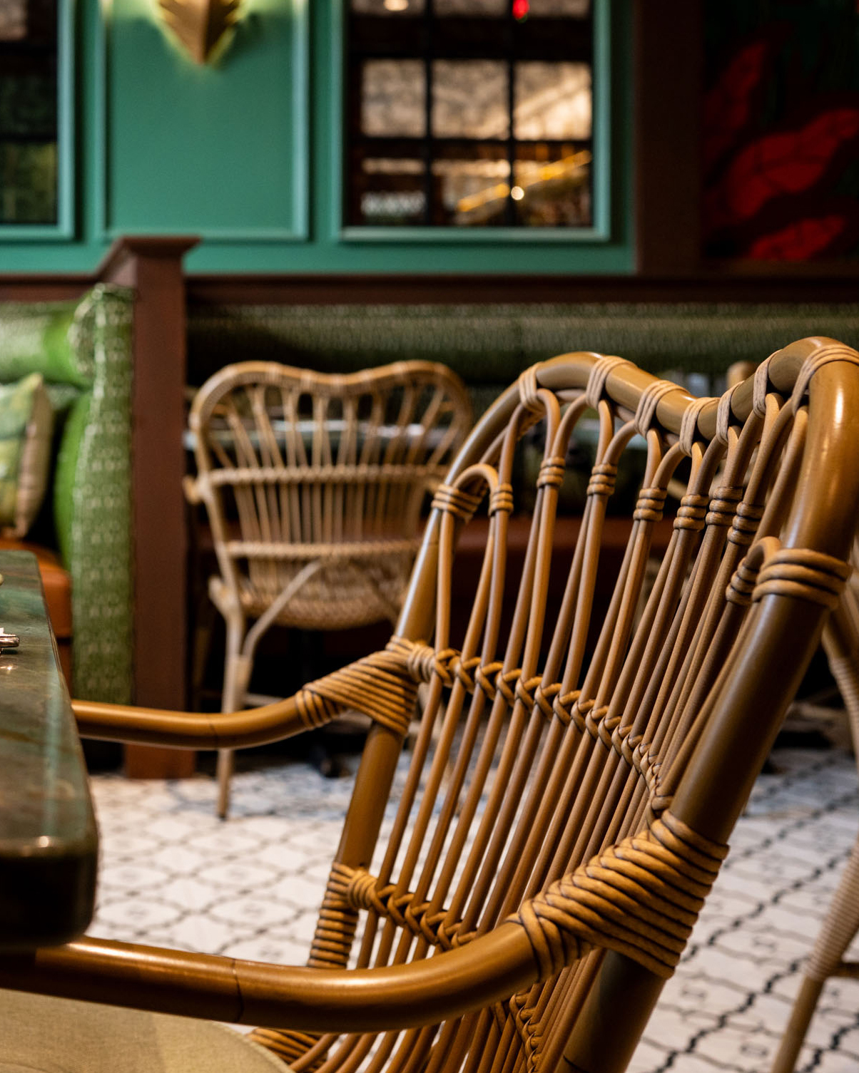 At Maison Lotus, every element works in harmony. The seating becomes part of the story, supporting the layered aesthetic while reinforcing a sense of comfort and permanence within the space. Its natural texture softens the richness of the surroundings, balancing bold color and architectural detail with warmth and approachability.